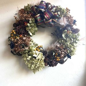 しばらく花瓶に飾っていた実つきのマートルをリースにしました。 マートルは初めて使いましたが、枝がしなるのにしっかりしてて、ワイヤーのような使い勝手で扱いやすかったです。 マートルだけなら通年使えるさわやかなリースだけど、ここにクリスマスのリボンをつけたら一気にクリスマスの雰囲気になりますね。 今年もいつもお世話になってるサロンにプレゼントする予定。サロンに飾ってもらえて、いろんな方に見てもらえるのが嬉しいです。 クリスマスが終わったらシンプルなグリーンリースとして使えるように、リボンは着脱式にしました。リボンにつけたワイヤーをフックに引っ掛けるようにしています。 リボンなしは作った直後の写真、リボンありは一日たった写真です。