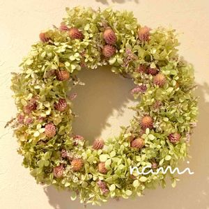 花屋さんのワークショップへ🌿 アナベルと千日紅のリース🌹 今回はクレッセントにしたくて🌙 難しかったけどなかなか良くできたのでは、と自画自賛😁✨