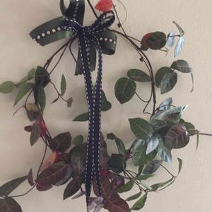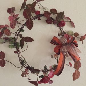 のびたつるで作ってみました。葉はあまり切らないのが好き。自然なままで。 リボンは渋好み