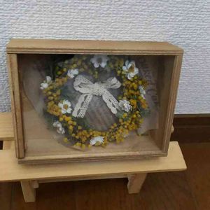 ミモザBoxアレンジ~✨ 壁に穴をあけられなくて…… でもミモザのリース飾りた~ いと 嘆いていた友だちにpresent💛🌿 これなら飾れる🎵