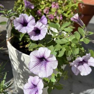 2024.7.6 切り戻し約5週間後 梅雨雷雨、7月になって35℃の猛暑 お花にとって過酷な環境ですが、 ラベンダーレースの花色がとっても美しいです🎵 株横幅60cm、高さ30cm、サフィニア中輪 花径6cm
