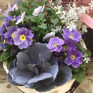 こんな 寄せ植え ありました❣️ ハボタン と、すみれ の 色の 対比 が 素敵💕🌸 ( 木村植物園 にて )