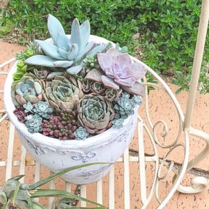 素焼き鉢を白く塗ってケーキ風に(*´∀`*)💕 たぶん朧月の葉挿しと、日曜に川崎の『タナベフラワー』さんで購入した大きい子と一緒に植えてみたの。 この後、花芽はカットして土に挿します。 これなら株が弱らないし、花も楽しめるし💕 以前、花芽を土に挿してたら根が出て(*≧∀≦*)❣️それは捨てちゃったから、これは経過観察しようと思う(*´∀`*) 秋にはぎゅうぎゅう寄せにしたいな。