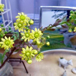 アエオニウム・チョコチップのお花🌸 やはり体に似合った細っそりしたお花でした。チョコチップは今年初めて花芽をつけたので、早めにカットして瓶に挿して置きました😊
