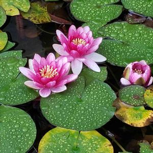 雨の日のスイレン。葉がしずく模様。今年も綺麗に咲いてます。