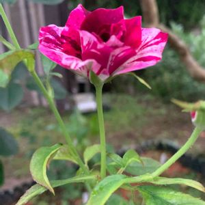 昨年、母にもらった小さな苗のパープルタイガー💜🐯 一度小さな花を咲かせたきり、せっかくのつぼみも虫に喰われたり、病気になり葉を落としたり、そんなことでお花は見られませんでした🤔 春のお花はいくつか咲いてくれそうです💜 うっすらと紫色の縁取りがあり、波打つような大きな細長い葉です。 イントゥリーグを親にもつ絞りのバラ🌹 楽しみです💓💓