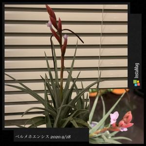 チランジア続きます。 1枚目:Tillandsia bermejoensis ベルメホエンシス ロッテアエっぽい質感で結構好きな種なんですが成長遅いです。 画像検索すると開花サイズや花序の色の載り方に結構ばらつきがあって面白いです。 最近知ったのですが、種小名の由来のベルメホ川とはボリビア南端からアルゼンチン北部を横断してパラグアイ川に合流する有名な方ではなく、サンタクルスデラシエラ南西の山間を流れる同名のローカルな川のことだそうです。これ、勘違いしている方も多いのではないでしょうか。 2枚目:Tillandsia sp. (仮称)ベルメホエンシス 何故かベルメホエンシスの名で本家より多く出回る例の謎種。見た目や質感はだいぶ異なり、素人目にも明らかに別物とわかります。アエラントスとイキシオイデスのハイブリッドという説が有力のようです。 こちらは立体的な花序から薄紫の花が咲くらしく、ベルメホとはまた違った美しさがあると思うのですけど、この名前で販売されたばかりに偽物のような扱いを受けているのがちょっと残念です。しっかり区別して売ってほしいですね😓