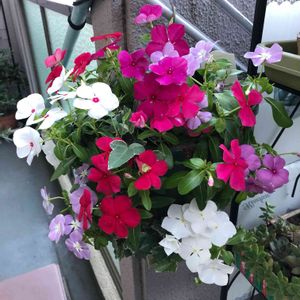 今日のお花【ニチニチソウ】 ひと月ほど前ノーブランドで安かったので7色買ってプランターとバンキングに植えました🪴 今は元気に育っていますが立ち枯れ病が心配です😓