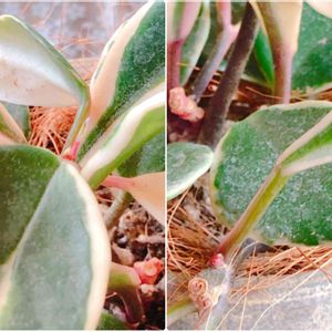 先月お迎えした ホヤカルノーサ・リップカラー。 ピンクの葉っぱが出てきました(* ˙꒳˙ * )♪写真だとわかりずらいけど、葉の縁がピンクだったり 白だったり、変化が楽しいですね✧︎とりあえず 順調に成長しているようで良かったです(๑˃̵ᴗ˂̵)و゙