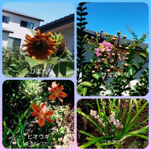 今日も35℃くらいかな〜、この先ず〜っと 連日こんな気温が続くようです🥵💦 庭は朝夕水遣りするだけで精一杯です。 ひまわりやサルスベリの花は青い夏空に映えて元気いっぱいですが、庭の少し木陰を見ると山野草のヒオウギやコヤブランが咲いてました。 花壇では、花友さんに頂いた真っ赤なフロックスが1輪、早く増えてくれるといいなぁ〜。 以前花友さんに頂いた種蒔いておいたら、名前が書いてあったお花と違うものが咲いた様。 グーグルに聞いたら「ハマナデシコ」と出ました。 初めてのお花、ナデシコって色々あって可愛いね。 真夏に咲いてしまったフジ、毎日お水たっぷり上げていますが、日差しが強くて葉は焦げて所々枯れ、花も咲いてはいるけど萎れてます…やっぱり5月頃の日差しが良かったね。😂