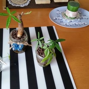 「趣味園」みてパキラをカット✂ 切る気も増やす気も全くなかったのに😅 左の水に挿してる子がカットした子。 右のハイドロボールの子が3年程前に同じく真ん中奥の子からカットした子。 葉っぱワサワサと元気です。 水耕栽培だと大きくならないので助かります😊