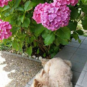 日陰で休む🐶 タイルが冷たくていい感じなんでしょう😊 みるきぃの定位置です。