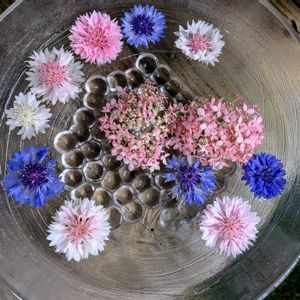 雨で倒れたヤグルマギクとアナベルピンクを浮かべました