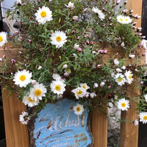 こちらは、玄関横の鉢植えコーナーの一部です 見切り品再生中のマーガレットがきれいに咲いてきました🥰