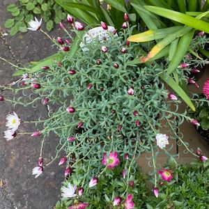 こんばんは😊 花かんざしは家の中で満開に、何故かペーパーカスケードは外でこの陽気で一気に開花🤍🤍 花かんざしより花弁が尖っていて凛々しい‼️ 花弁に赤いラインが入っているのが咲き始めだから、アクセントになって面白いですよね😄
