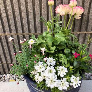 今日は4月の陽気になるそうですね。 朝からとても暖かいです。☀️ 優しい色のラナンキュラスに出会い 寄せ植えにしてみました🌸🌿