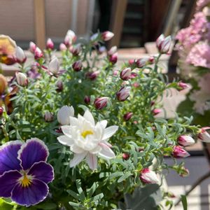 母にプレゼントする寄せ植え💕 ピンクが好きなので、ピンク中心で♪(蕾のうちはペーパーカスケードもピンクなので👍) 優しい感じになりました😊✨