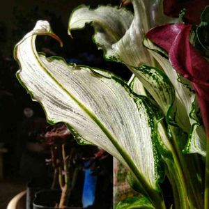 斑入りを通り越して、ほぼスケルトン‼️ カラーのフローズン・クイーンです。 うちに来て3年目✨ 昨年は緑の葉っぱしか出て来ず💦 もうヤケになって球根を掘り起こさず植えっぱなしで放置していました。 そしたら…殖えるし綺麗な葉っぱ出すし、ワインカラーの花が咲くし、すっかり良い子になりました💓 透け透けの葉っぱのカラー、葉焼けさえ注意すれば強い子です😁