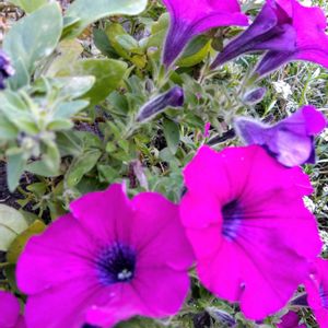外でまだまだ 咲いてくれてます アイビーゼラニウム 薔薇 サフィニア 青空 夕焼け
