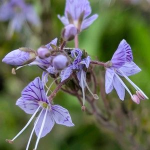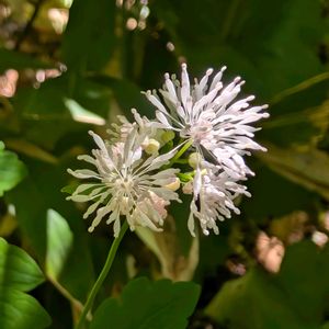 皆さんの投稿を、羨ましく思っていましたが、やっと出会えました♪ ミヤマカラマツ(深山唐松) キンポウゲ科 カラマツソウ属 多年草 北海道、本州、四国、九州に分布。 湿り気のある林緑、林床、時に高山に生育。 茎は直立、高さ10〜80cm。 根出葉は1〜2個。葉身は2〜3回3出複葉。小葉は狭卵形から広卵形、または広倒卵状菱形。縁に粗い鋸歯。基部に小托葉はない。 花序は枝先または葉腋から散房状につき、直径約8㎜。白色または淡紅色。 萼片は3㎜ほどで楕円形、白色から紫色で花期には落ちる。 花弁はない。 雄しべは多数で元が細い。雌しべは数個。 果実は三日月形の痩果。 花期5〜8月 ④は開き始めで、萼片が付いてます。 6月29日撮影 磐梯山
