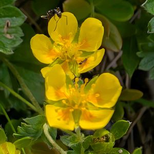 緑色の風景に黄色が目立ってました♪ ミヤマキンバイ(深山金梅) バラ科 キジムシロ属 多年草 北海道、本州(中部地方以北)に分布。 亜高山〜高山の礫地に生育。 葉は3出複葉、小葉は倒卵形、粗い鋸歯がある。茎葉は小さく1〜2個つく。 花は直径1.5〜2cm。花弁は広倒卵形、5個つき花弁の先はややへこみ、付け根の部分は橙黄色。萼片と副萼片はほぼ同長、副萼片の幅がややひろい。 雄しべは普通20個、雌しべは多数。 痩果は10〜40個つき、長さ約1.5㎜。 花期6〜9月 6月29日撮影 磐梯山