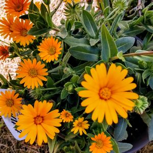 先日の暖かさでカレンデュラ(キンセンカ)・スノープリンセスがたくさん咲いてくれてます😊 種まきから177日目/5ヶ月と24日目。 【1枚目】こちらは寄せ植え鉢のスノープリンセス。1株ですが4つも一緒に咲いてくれました。今まで一つずつしか咲かなかったので一気に賑やかに😊 【2枚目】寄せ植え鉢を逆から。この株は花芯が黄色いタイプですね。 【3枚目】こちらは2月13日に測量した際の鉢植えで、その際の蕾が一気に開きました。でもちょっと株が乱れ気味です。暴れまくりますね、このスノープリンセスって💦 花支えがあった方が良さそうです。 【4枚目】こちらは地植え組。 これも花芯が黄色いタイプですね。結局、花芯が焦げ茶色のタイプは今のところ1株だけです。ずいぶん偏っちゃったわ💦 まだ未開花のものが地植え組にあと2株あるので、ぜひ焦げ茶タイプが咲いて欲しいな😊🙏