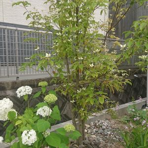 常緑ヤマボウシ 花は普通のヤマボウシより一回り小さい。 細く枝分かれした先に1輪づつ咲くようです😊 マンションの北側に植えられていて、初めて見ました😊