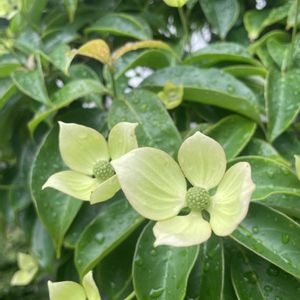 ジョウリョクヤマボウシ 常緑山法師 ホンコンエンシス ミズキ科ミズキ属 紅葉しませんがお花(萼)がとても大きく華やかです🤍💚 月光という品種名が付いてました💛 これから益々大きくなります🤍