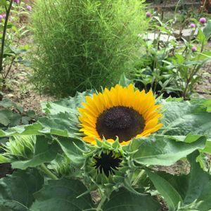 おはようございます😃 やっぱり今日もひまわり🌻 我家のミニひまわりが、開花~ ♪♪♪ 寸足らずです。 なんだか?頭に王冠載せてるようにも見えてきた~ コキアが、あちらこちらで生えてます~✨