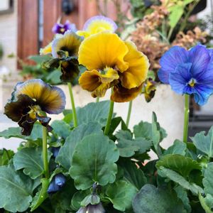 おはようございます(*^^*) イエローとブルーを一緒に植えて 玄関でお客様に笑顔をお届け(⁎ᴗ͈ˬᴗ͈⁎)