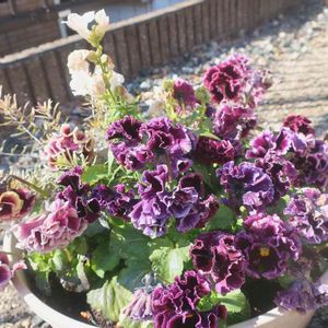 こんにちは🎶 作った当初より立ち上がって元気になってきた横長寄せ植えさん おとぎの国に招待しました(笑) 寄せ植え ビオラ バレリーナチュチュ2株 バコパ ホワイト ネメシア ピンクレモネード2株 葉牡丹 ブラックサファイア プラチーナ ウェストリンギア コクリュウ 夕方から夜勤です🌃