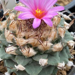 おはようございます😃 いまいちな天気ですが、開花してくれました🌼 1番奥のトレーにいるので、腕を伸ばしてこれが限界😅笑 コリファンタは可愛くてお花も綺麗でオススメです♡ 綿毛も🌵もふもふですので調子のって触ってると刺に当たります😂笑
