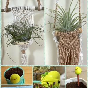 今日のお花💠チランジア 前から気になってたエアープランツ💚 マクラメ編みのプラントハンガーを作って お迎えしました〜☺️✨ 左が百均で右がホムセン、どちらもチランジア になってしまいました😅💦 ガチャガチャで見つけた小鳥ガーデン🐦 シマエナガが欲しかったけど…セキセイインコ🦜 +ネモフィラでした💠 花の種と膨らむ土付き。芽が出たので大きな鉢に移し 替えました🪴まだヒョロヒョロ〜🌱お花咲いてくれるといいなぁ🌸