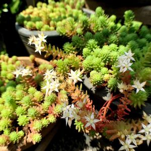 奥→右→左… ずんずん勝手に増殖するセダム パリダム⭐︎ 右と左の鉢には以前、アイビーやミニシクラメンがいたのですが、ちょっと弱った隙に…でもセダムのお花が可愛いので、文字通り、手放しx野放しです😌
