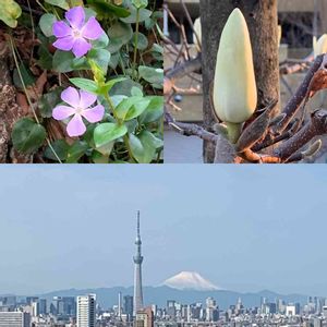 早春 雨あがりで暖かく、ツルニチニチソウとハクモクレンが咲き始めていました。 富士山とスカイツリーもきれいに見えていましたよ。🗻