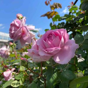 ヘレンさん、すごい勢いで開花しています!今年は南東の日当たりの良いフェンスへ誘引しました! 見た目も大きなお花と花数で圧倒、香りも良く、トゲも割と少なめ、切り花にしてもすごく花もちがよいので素晴らしいバラです。