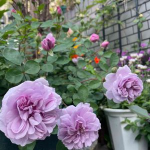 犬走りの壁際に並べたシュラブ系のローズドゥグランヴィルさんを筆頭にレイニーブルーさん、プシュケさんが続々と開花し始めました!