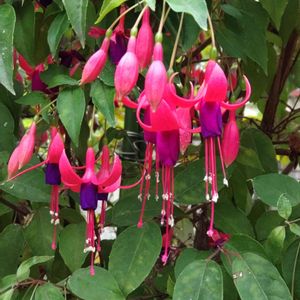 下向きに花を咲かせる花姿が とっても可憐なフクシアです。 このフクシアは 日本で開発されたエンジェルス イヤリングと言う品種です。 一般的にフクシアは夏の暑さが苦手ですが この品種は 耐暑性が強く10月〜11月に再び花を咲かせます。 日当たりの良い所では冬越しも可能なほど丈夫です。 南アメリカ原産。 アカバナ科フクシア属の多年草。
