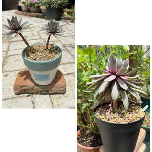 センペルBOXの鉢上げしてたら ギューギューだったからか【ブラック】がめちゃ徒長してた💦 で、茎が長〜い状態で仕立ててみた 名付けて『アエオニウム仕立て』笑