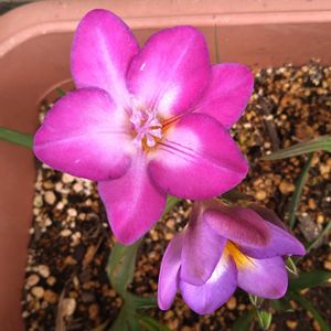 フリージア💗🥰💗💜🌿 2つ目(下)咲き始めました 4/18に咲いた1つ目(上)の花をよく見ると 💜紫色から💗ピンク色へ変化してきました 2025.4-91