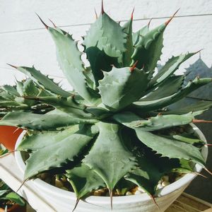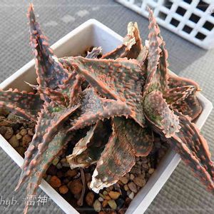 雷神。アガベじゃなくてアロエ。朝晩が冷え込み始めたら赤くなっていたけど、簡易温室に入れたら緑に戻ってきた。赤はストレス色だから、コイツは寒さに弱いのか。