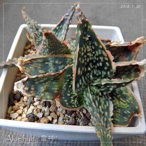 アガベ記録写真 2018/7/2撮影 ウチのアガベ番号8-1番 「雷神」さん♪ 本来の8番親株さん最近調子崩しているので…、 子株8-1、8-2、8-3、8-4、8-5と居る中で、 8-1番さんの登場なのですが、 この子も絶好調には程遠い。。 子株たち5株は最近植え替えたので復活待ち♪ 親株は…、 今日か?明日植え替え予定、 面倒だけど今から頑張りますか!(*^.^*)