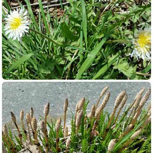 買い物にでかけたら、歩道の端に 白花タンポポとつくしを見つけました~🐱🎵
