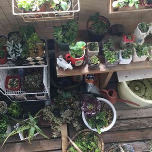 雨降りの日ベランダで、アエオニウムの鉢が花盛り!花じゃないけど。 アエオニウムが好きで、アレコレ買ってみたけれど、消えかかってる子もあり😢 そんな中、ベロアは元気! サンバーストとムーンバーストも元気!太陽より月の方が大きい! この子達から元気もらってます(o^^o) この角度からは見えないけど、夕映えも元気です!