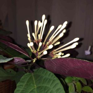 クレロデンドルム・クアドリロクラレ 綿棒から開花⁉️part2 置き場所を変えて別アングルから🤳 裏葉の銅色をチラ見せし チョコリーフも一緒に合わせてみました😊 南国フィリピン原産でこの時期に咲く花 北関東では管理が難しいかな💦冬越し頑張る💪