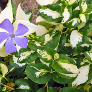ツルニチニチソウ ・ワジョージェムです。普通の斑入りツルニチニチと違って、斑の入り方が中斑(外側が緑、内側はクリーム色の斑)になっていて、明るい印象です。花は同じようなブルーのお花で、この色が好きで一昨年苗を買いましたが、開花は初めてです😃