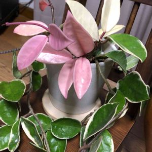 ホヤ リップカラー 寒い玄関の棚上の方でキレイなピンクに 染まっていたので日当たり良い リビングの窓辺に移動してみた💕 🪴可愛い葉っぱ😍