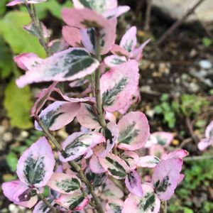 斑入りツルマサキ "ダンズデライト" 斑入りの葉っぱが寒さで ピンク色に染まっています💕💕 冬枯れの小さな庭の沙羅の木の下で 強風に揺れながら耐える姿が愛おしい 昨日UPしたかったけどお出掛けしていたので 1日遅れの🏷8日は葉っぱの発表会に 参加お許しください🙏🙏