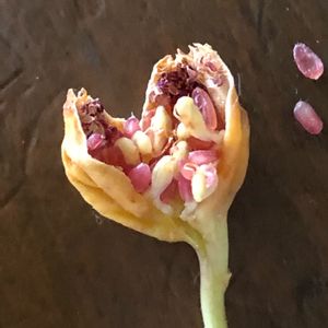 コバンボダイジュの花の中… 小判菩提樹(コバンボダイジュ)はクワ科イチジク属の 常緑低木。隠頭花序で、熟すると黄色から赤橙色になる。 先日2/8にUPしたコバンボダイジュの木から 黄色くなって落ちてしまった花の中を ちょっと覗いてみました🤗 なるほどイチジクみたいな感じです。 ポロっと落ちてきた赤いのはタネ?🤔 なんとも不思議なコバンボダイジュ🌿 葉っぱから花、中身まで楽しませてもらいました