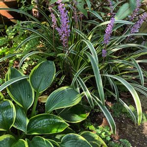 斑入りヤブラン 斑入り葉🌿とパープル🌸③ 花友さんが株分けしてくれたヤブラン 何ヵ所かに分けて植えてありますが ここは西日が当たる花壇 それぞれいい仕事してくれています💕